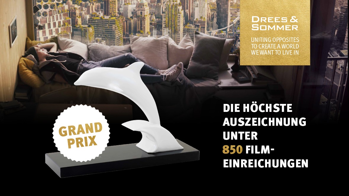 Für seine einzigartige Storyline und Umsetzung erhielt der Drees [&] Sommer-Imagefilm „THE BLUE WAY, Next Exit” ganze sechs Auszeichnungen bei den Cannes Corporate Media [&] TV Awards 2020. Darunter der weiße Delphin, die höchste aller Auszeichnung, die nur ein einziges Mal unter allen goldenen Preisträgern der insgesamt 850 eingereichten Beiträge vergeben wird. Mit dem blauen Delphin erhielt Cinecore, mit der Drees [&] Sommer den Imagefilm verwirklicht hat, ebenfalls die höchste Auszeichnung als beste Produktionsfirma. Außerdem räumte THE BLUE WAY next exit auch noch zwei Awards in Gold in den Kategorien „Imagefilme“ und „Corporate Videos“ und zwei in Schwarz in den technischen Kategorien „Beste Kamera“ und „Bestes Sounddesign“ ab. Die Verleihung der Cannes Corporate Media [&] TV Awards fand am 24. November 2020 virtuell statt.