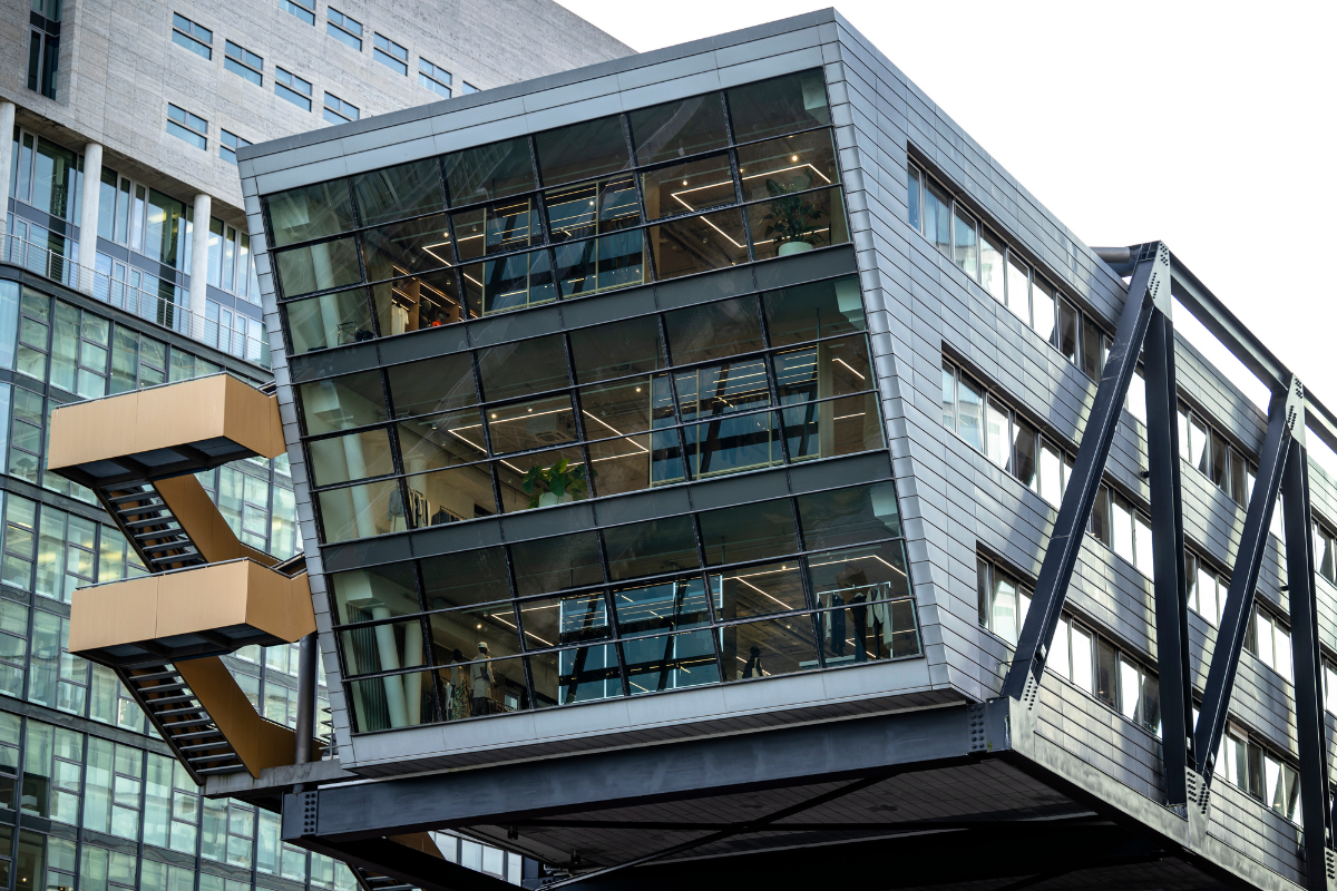 Der Wolkenbügel, ein Bürohochhaus mit markanter Architektur, schwebt imposant über dem Wasser des Düsseldorfer Medienhafens. Mit seiner besonderen Konstruktion auf nur vier Hauptsäulen und einer Höhe von bis zu 23 Metern zählt das Gebäude am Wasser zu den Wahrzeichen der Stadt und überzeugt mit seiner exklusiven Lage am Hafenkopf. Der Projektentwickler Art-Invest Real Estate hat den Wolkenbügel umfassend modernisiert, um ihn nachhaltig und zukunftsorientiert aufzustellen. Ein Highlight ist die innovative Begrünung von Dach und Fassade: Über 3.700 Pflanzen sowie 250 Quadratmeter grüne Matten verbessern nicht nur das Mikroklima, sondern schützen die Gebäudestruktur vor Witterungseinflüssen. Ergänzt durch energieeffiziente Gebäudetechnik und eine moderne Dämmung wurde das Haus technisch auf den neuesten Stand gebracht.