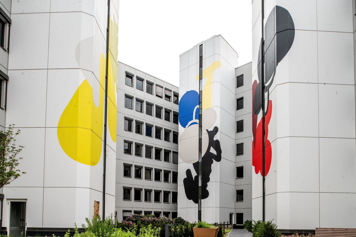 The centrally located office building at the corner of Adlerstrasse and Schirmerstrasse, built in 1987, stands out due to its special shape: Three building wings with up to seven floors are grouped around a landscaped courtyard on an area of 2,661 m². Now the building looks uniquer because of the three stair towers that have been made more attractive with large-format artworks. These artworks were created by Denise Werth, who this year successfully completed her liberal arts studies at the renowned Kunstakademie Düsseldorf under Prof. Thomas Scheibitz. Previously, she was in the class of Prof. Katharina Fritsch. Werth has been represented in numerous exhibitions in various art associations, KIT, Folkwang Museum, Museum Kunstpalast (Die Grosse) and now won the 10,000 euro tender for the office property of Art-Invest. "The work Notes on an unconditional form shows syntheses of forms from my collection, which have been combined into three different compositions and applied as large paintings to the tower facades in the inner courtyard. With their intense colors and formal arrangement, they contrast with the geometric appearance of the architecture," says Werth.