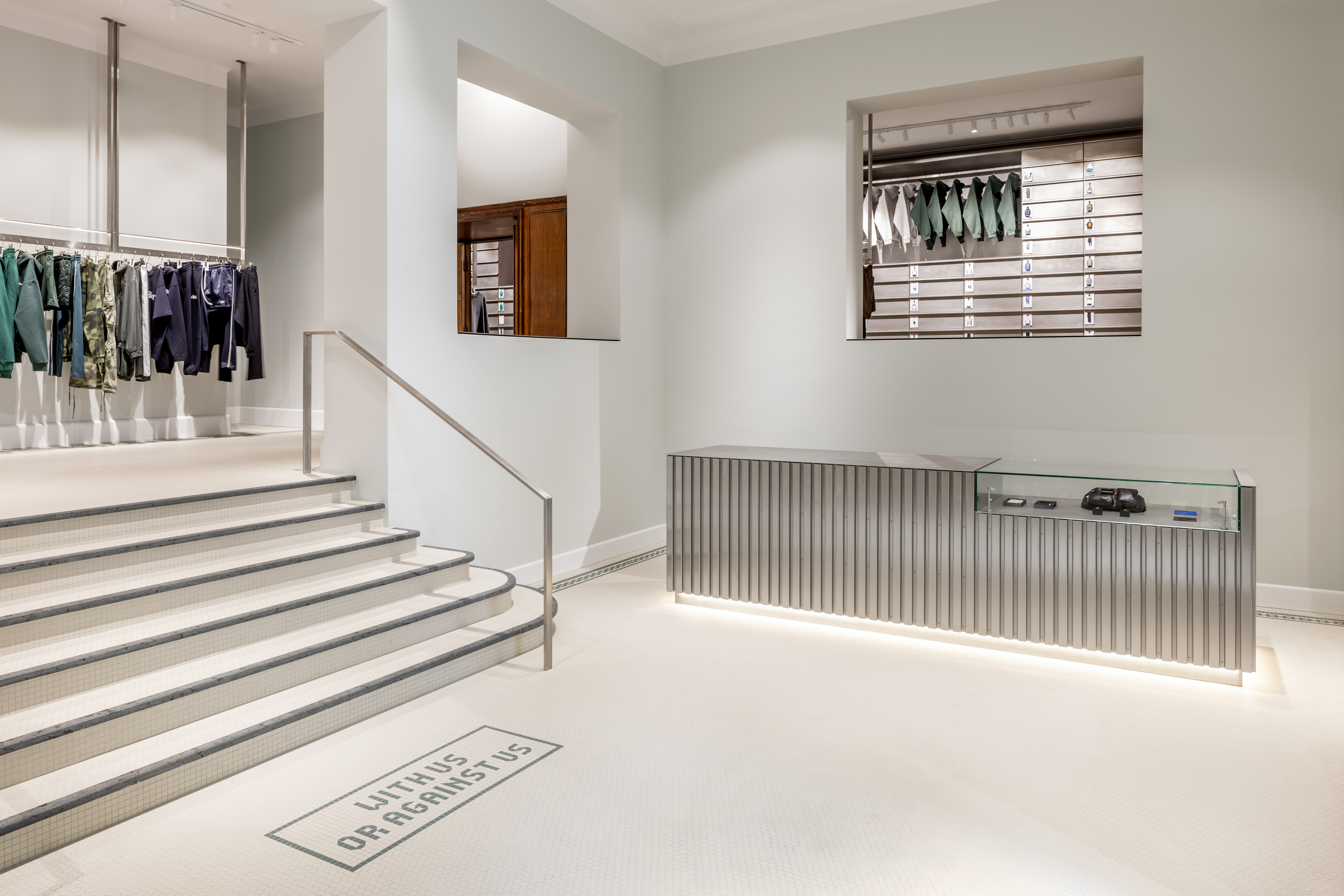 As in the other stores, the brand again relies on the collaboration with the architects of Schwitzke [&] Partner. "We are delighted to have the renewed commitment with LFDY. From Cologne to Hamburg, to Amsterdam, each of our designed stores has its own unique profile," says Tina Jokisch, of Schwitzke [&] Partner. "Berlin, more than any other city, represents the clash of modernity and history, which is also reflected in the store space," Jokisch explains. Five-meter-high stuccoed ceilings and a stainless steel-encased checkout counter in the entrance area are the prelude to a unique customer journey rich in contrast: a sweeping staircase leads to the sales area located on the gallery. From there, a historic double-winged door leads to the former movie theater. The room impresses with a listed wooden floor and paneled walls that have remained virtually untouched. This is where the typical LFDY cabinet system was placed. This is the largest at LFDY to date, measuring 11 meters in length and 186 drawers. To create a tech-cool contrast to the historic space, all presentation elements were made of stainless steel. Throughout the store, Schwitzke [&] Partner implemented an expressive design concept that breaks with conventions and plays with contrasts. Hexagonal tiles and a dark green border with the words "with us or against us" accentuate the spaces. In Berlin, LFDY shows all facets of its ever-perceptible holistic approach: designer furniture such as curved THONET chairs, a Barcelona lounger by Mies van der Rohe, large-format works by photographers Paul Hutchinson and Tobias Zielony, and a mirror image by artist Astrid Klein round out the interior compositionally. For the first time, LFDY combines a triad of retail, design and café in its new flagship store.