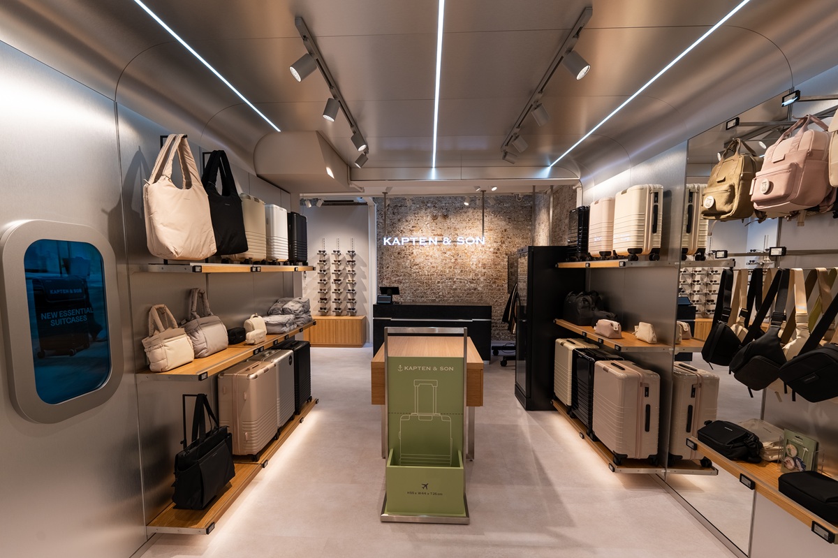 The highlight of the store is the so-called suitcase tunnel: an intense, metallic room concept with video screen windows that evokes the feeling of an aeroplane and brings to life the wanderlust that is part of Kapten & Son's brand DNA.
