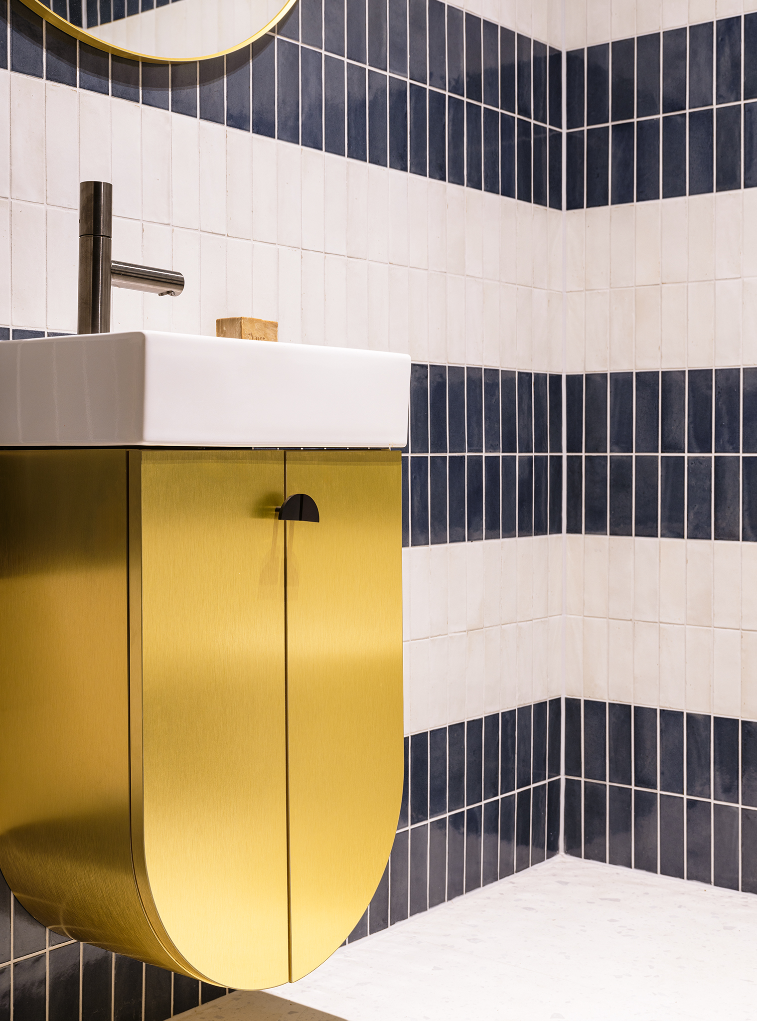 The apartment combines different styles and contrasts, creating its own distinctive look: vintage meets contemporary. Elegant tones such as yellow and gold dominate the living room, while the black kitchen with a cherry red marble cooking island provides a contrast. Visible concrete surfaces contrast with the warm, harmonious colors and golden metal surfaces of the cabinets, which can be found in all rooms. The golden surfaces are not just decorative: they reflect the surroundings and lighting moods, immersing the rooms in a warm atmosphere and playing with the light sources. A different effect is created depending on the time of day and point of view. Individual walls in the hallway, hand-painted by Fabian Freytag, underline the uniqueness of the apartment. Furthermore, the perfection of the architecture was to be contrasted with an inner break: Vintage furniture enriches the room with its stories of times gone by. The walnut bar furniture next to the loggia is from the Fabian Freytag collection and completes the concept. The bathrooms impress with the contrast of high-quality glazed tiles in blue and white and bathroom furniture made of brushed metal with a gold look. The show apartment on the 11th floor is approx. 120 m² in size and has a total of three rooms, two bathrooms, a guest WC and a utility room. The apartment is rounded off by a loggia with a view of the Frankfurt skyline.