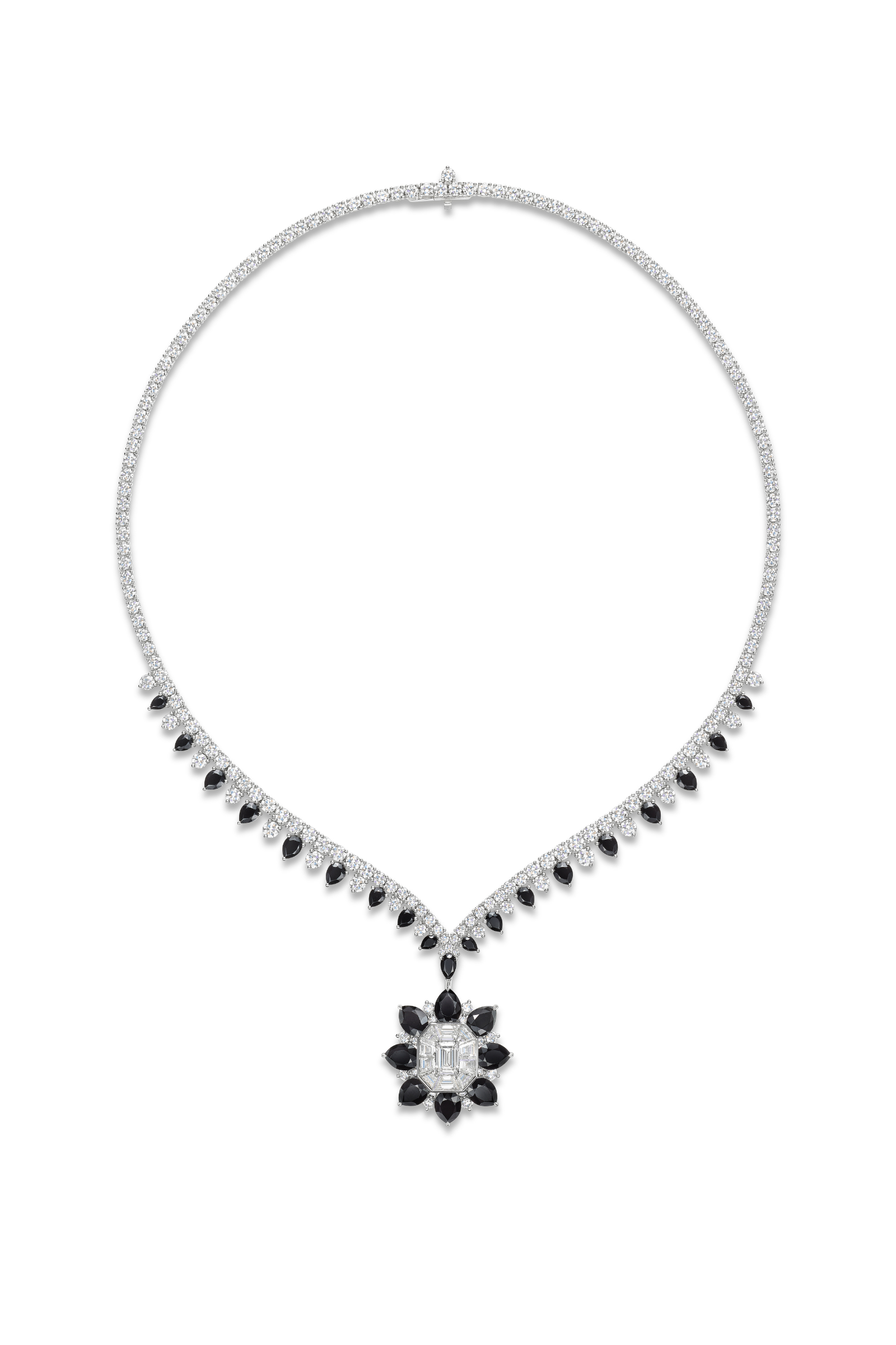 Inspired by the black-and-white facets of the marble in the salon, the jewellery transforms precision and colour contrasts into a wealth of geometric forms. Consisting of a set comprising a necklace, earrings and a ring, the design features an arrangement of ten gemstones in teardrop cuts set around several emerald-cut diamonds, blending colour and light into a magnificent work of art.